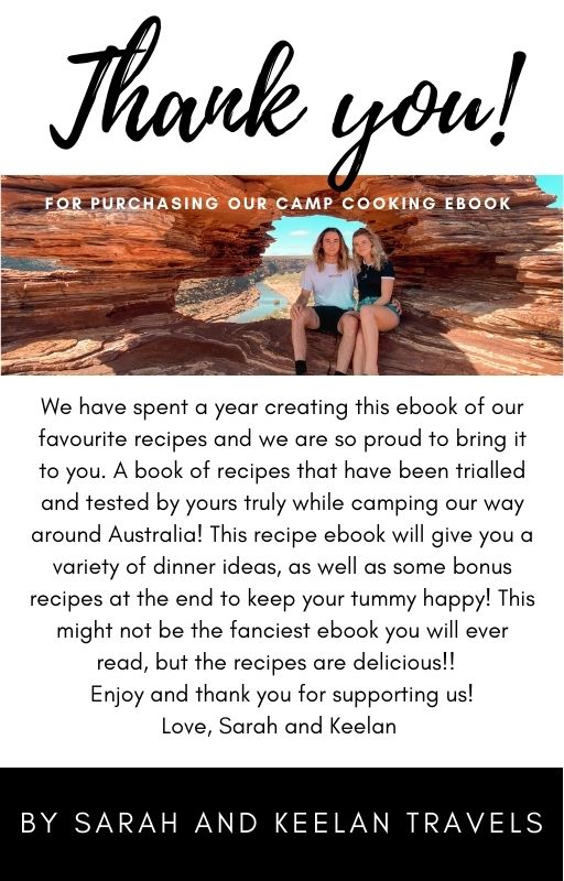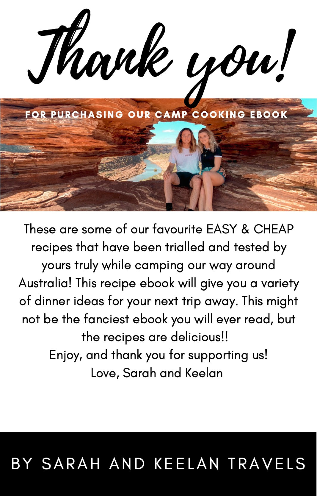 This eBook is a collection of our favourite recipes! These recipes are easy to make & cheap! They have been trialled and tested by yours truly while camping our way around Australia! This recipe ebook will give you a variety of dinner ideas (14 recipes). This might not be the fanciest ebook you will ever read, but the recipes are easy, cheap & delicious!! Enjoy and thank you for supporting us!