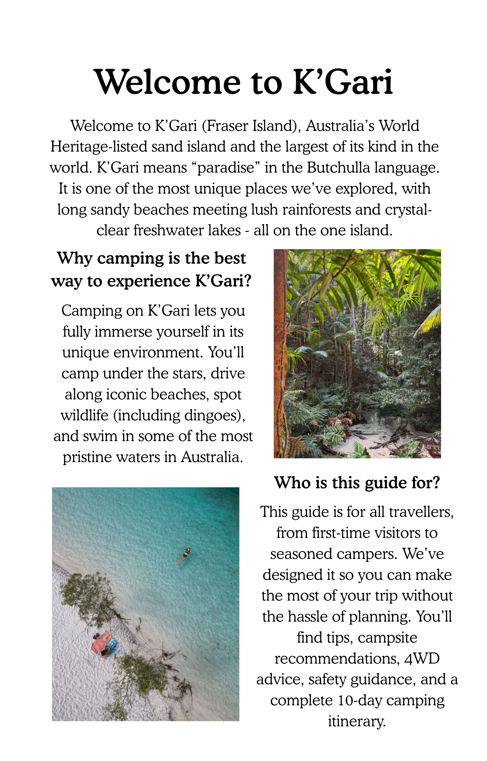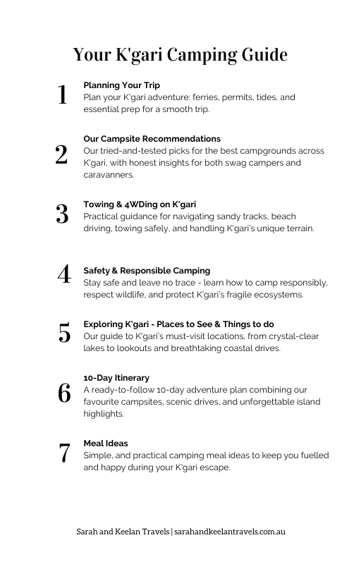 Discover the ultimate camping adventure on K’Gari (Fraser Island) with our 50-page eGuide. Packed with everything you need for a safe, fun, and unforgettable trip: