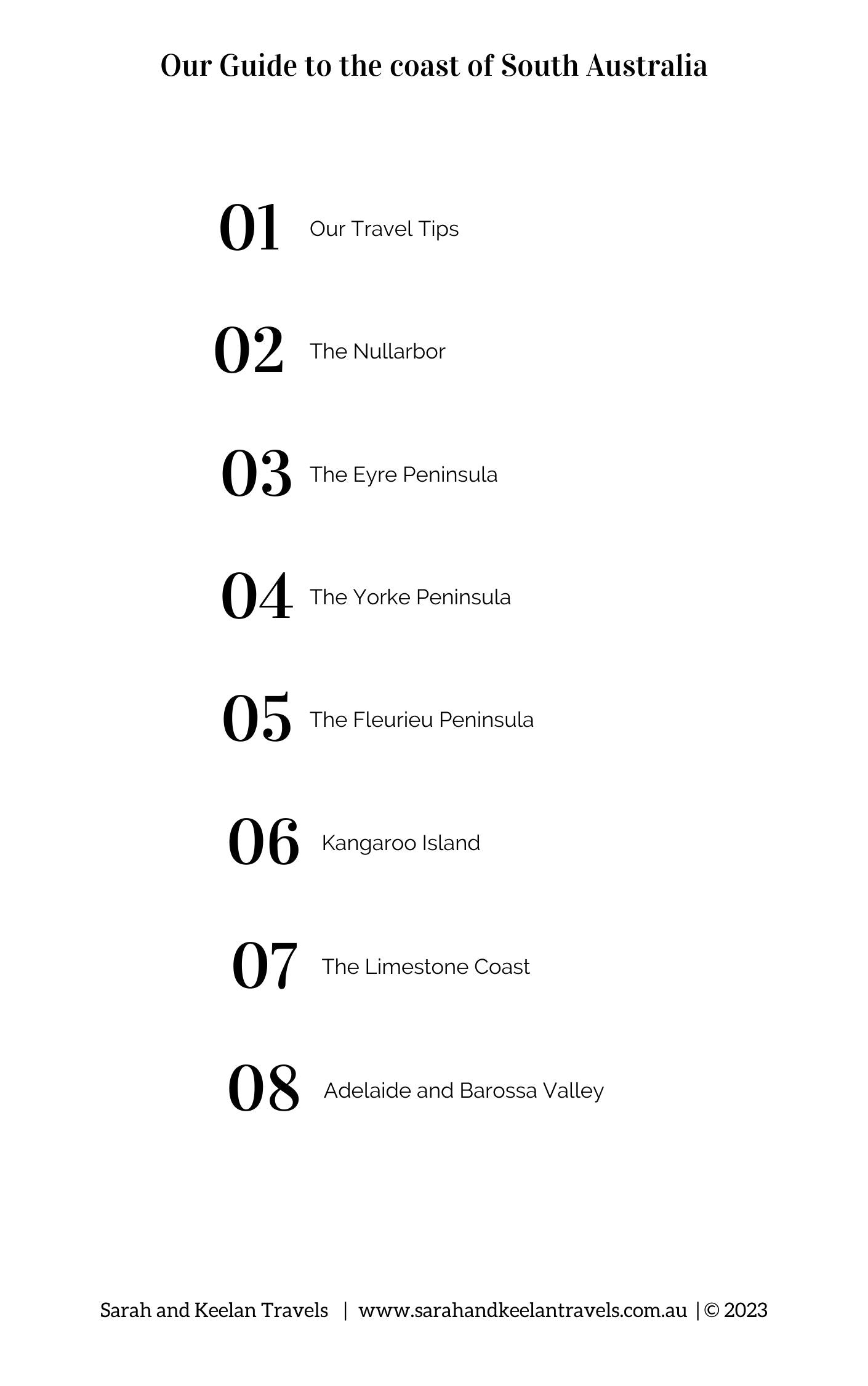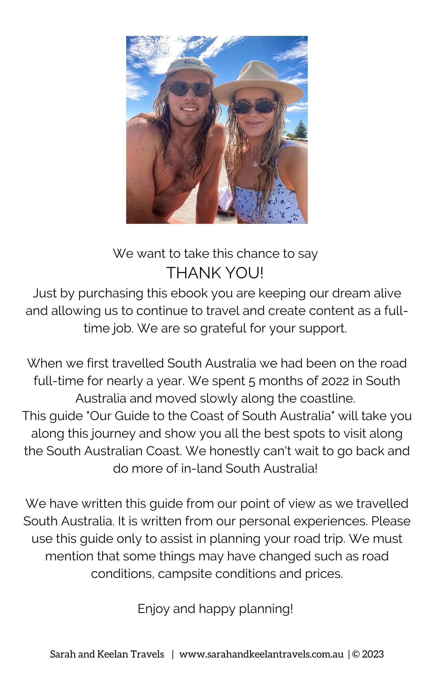This 50-page ebook gives you full itineraries for each area, where to stay, costs, things to do, places to see & much more! We are so grateful for your support and we thank you for purchasing this ebook. We hope you love it and enjoy the South Australian coast as much as we did!